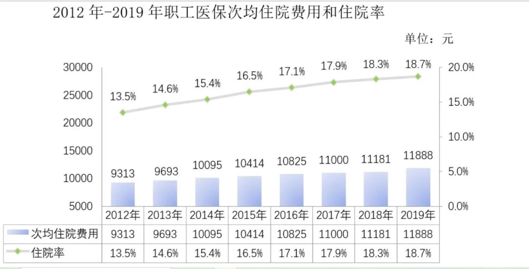 据了解,在现行医保制度中,门诊费用主要是靠医保个人账户来支付,超出一定额度再由统筹基金进行报销。对门诊医保使用的限制会导致住院量的增加。据2019年全国医疗保障事业发展统计公报,2019年,全国职工医保次均住院费用为11888元,比上年增长6.3%。并且自2014年至2019年,全国医保次均住院费用和住院率均呈上升趋势。