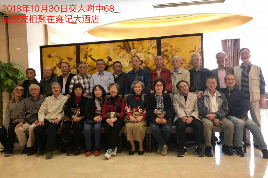 老翁(一排左一)和交大附中老三届的同学们,一排右一为俞锦杰,美籍华人,美国JY建筑规划设计事务所总裁,附中校友会会长,二排左二为作者